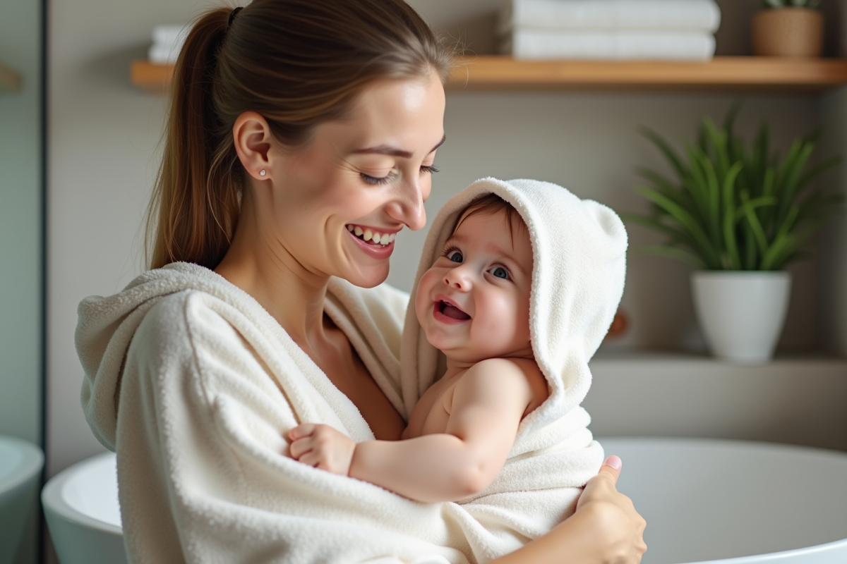 La clé d’un après-bain paisible, c’est l’anticipation. Avant même de sortir le bébé de l’eau, ayez toujours une serviette bien chaude et douce à portée de main. Rien de pire qu’un contraste brutal entre la chaleur du bain et une pièce froide. Idéalement, la salle de bain doit afficher autour de 22 °C pour éviter tout choc thermique.